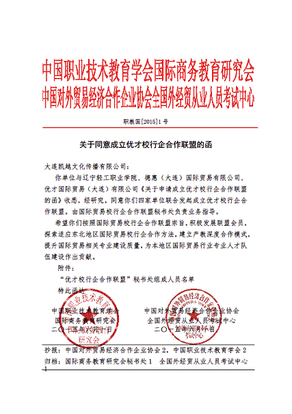 2015年6月10日经过前期的筹备,经中国职业技术教育学会国际商务教育研究会和中国对外贸易经济合作企业协会批准,由大连凯越文化传播有限公司与伟德国际1946、德慧(大连)国际贸易有限公司、优才国际贸易(大连)有限公司优才校行企联盟获批成立。