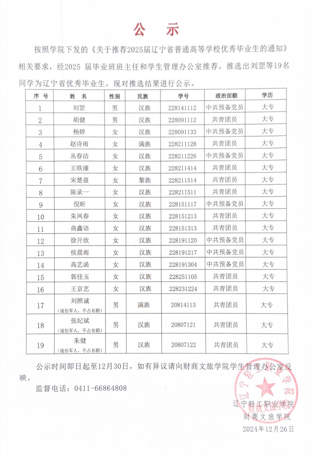 关于伟德国际1946推荐2025届辽宁省普通高等公司优秀毕业生结果的公示
